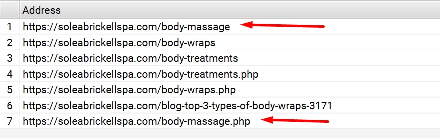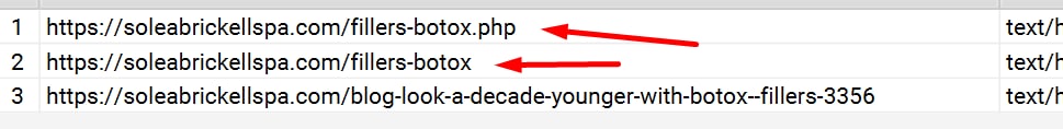 - Die Website-Indexierung funktionierte fehlerhaft. Die Dateien robots.txt und sitemap.xml waren falsch konfiguriert, was zu doppelten Seiten in der Suche führte. Zum Beispiel existierten die Seiten /fillers-botox.php und /fillers-botox gleichzeitig, was die Suchmaschinen verwirrte. Außerdem gab der Antivirenscanner ständig Warnungen beim Besuch der Website aus, und 30 zuvor zugängliche Seiten zeigten plötzlich einen 404-Fehler an.