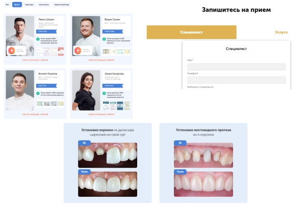 We set up advertising campaigns in Yandex.Direct and Google Ads for targeted queries (e.g., "dental implant cost," "zoom 4 whitening moscow"). This allows you to get leads from day one.